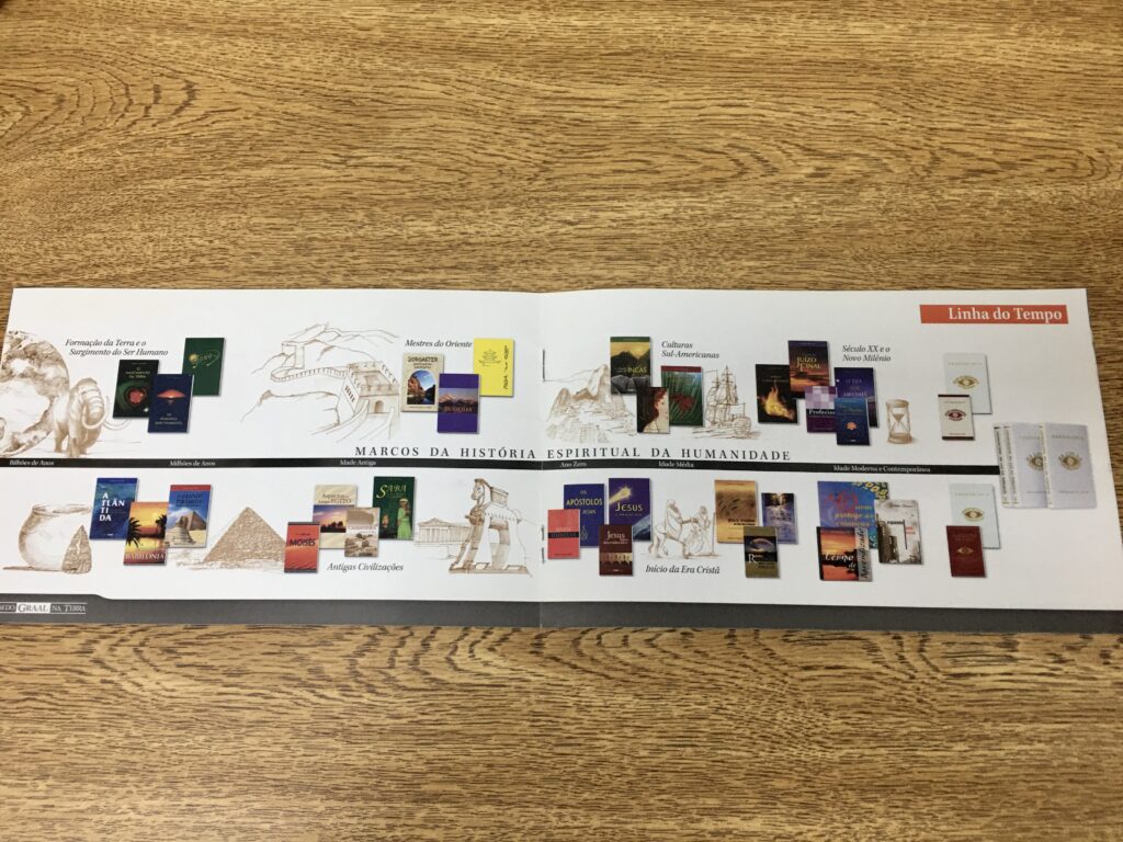 Na linha do tempo acima é possível ver os livros que retratam a vida de povos antigos, historias mais atuais e a Mensagem do Graal. Trás narrativas riquíssimas espirituais.